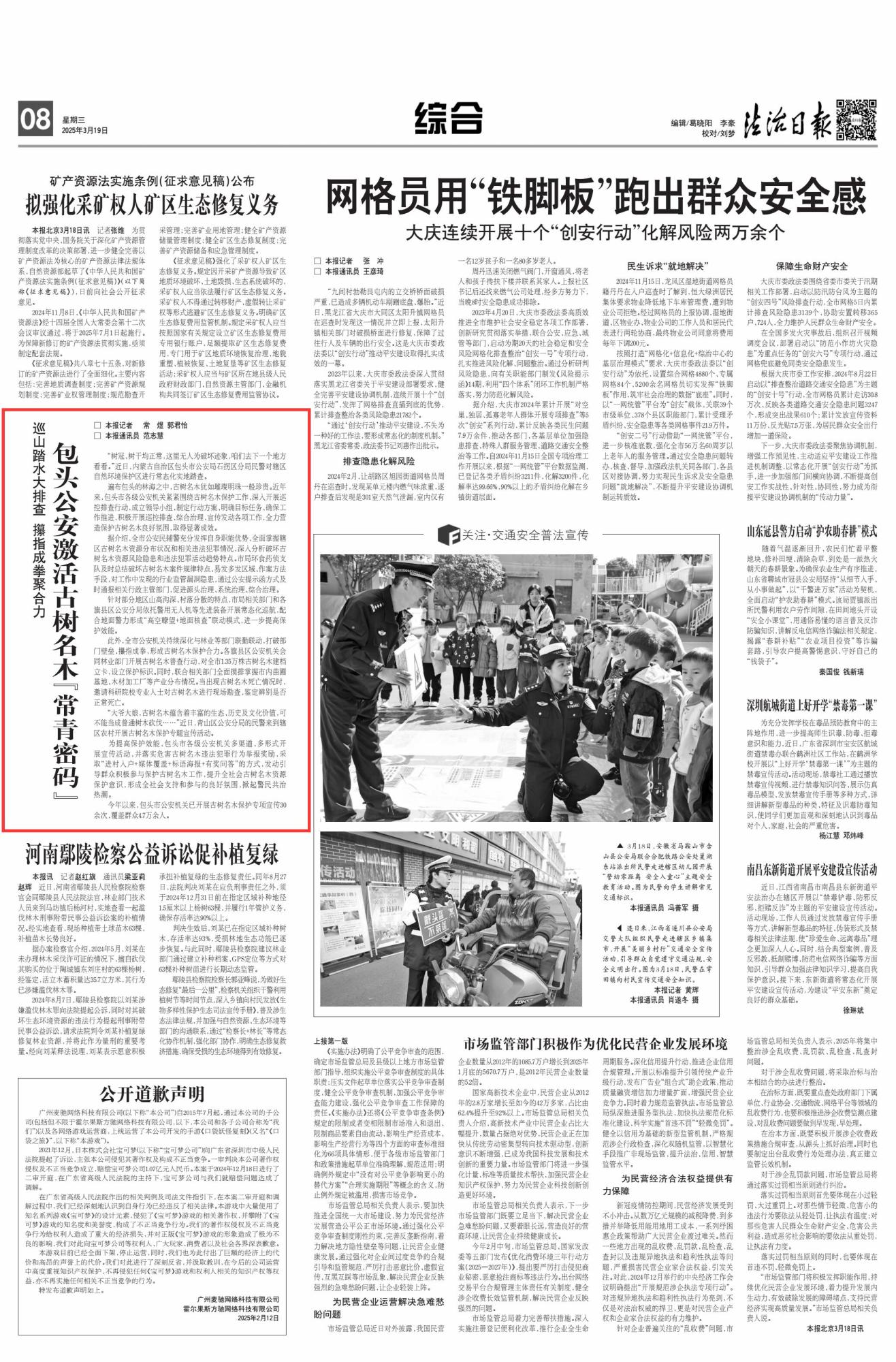 2025年3月19日,《法治日報》第8版刊發(fā)題為《巡山踏水大排查 攥指成拳聚合力 包頭公安激活古樹名木“常青密碼”》的文章,報道了近年來,包頭市各級公安機關(guān)緊緊圍繞古樹名木保護工作,深入開展巡控排查行動,成立領(lǐng)導小組、制定行動方案、明確目標任務(wù)、確保工作推進,積極開展巡控排查、綜合治理、宣傳發(fā)動各項工作,全力營造保護古樹名木良好氛圍,取得顯著成效。