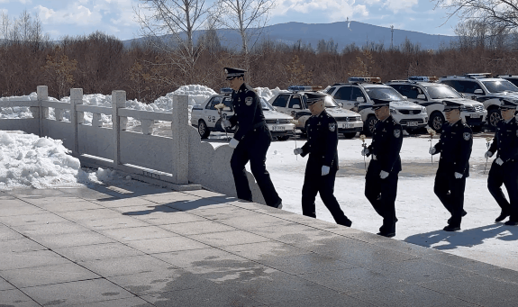 內(nèi)蒙古大興安嶺森林公安局根河分局民輔警向烈士紀(jì)念碑獻(xiàn)花。