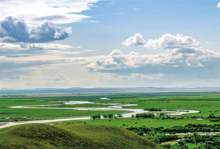 在額爾古納國家濕地公園,登上刻有“亞洲第一濕地”標(biāo)志的山頂觀景臺,遠(yuǎn)處的山巒、近處蜿蜒流淌的根河與額爾古納市容市貌盡收眼底。