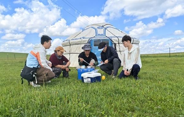 馬騰帶領(lǐng)團(tuán)隊在內(nèi)蒙古錫林郭勒大草原采集自然發(fā)酵乳。左三為馬騰。受訪者供圖