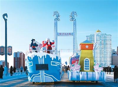 蒙古包群的另一邊,以馬為主題的彩色冰雕喜迎農(nóng)歷馬年;13米長的未來機(jī)車巨型冰雕融合聲光電技術(shù),營造科幻氛圍;以曲棍球冠軍群像為主題的雪雕群成為游客拍照留念的打卡點。