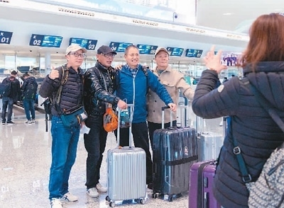 2月8日,前往印尼巴厘島的旅行團(tuán)游客在浙江杭州蕭山國際機(jī)場T4航站樓拍照留念。 龍 巍攝(人民圖片)