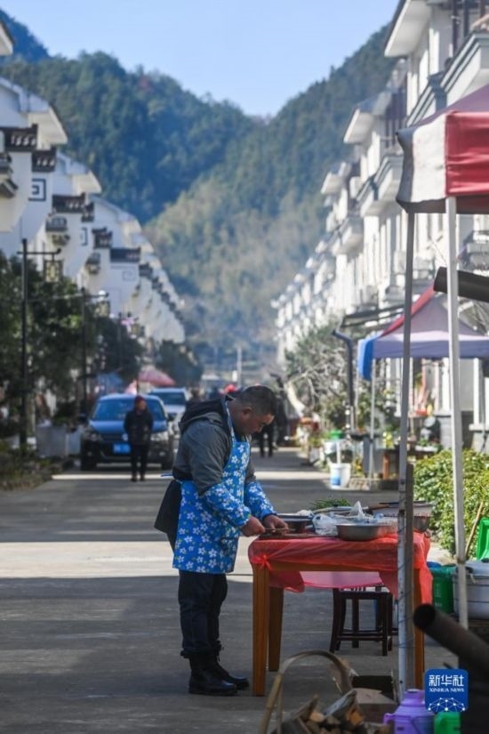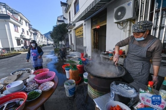 2月26日,蓮花鎮(zhèn)戴家新村的村民在新居門前烹飪農(nóng)家菜,為百家宴做準備。