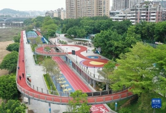 4月24日拍攝的福州市鼓樓區(qū)西河智慧體育公園內(nèi)智慧跑道、智慧健身器材及健身驛站等(無(wú)人機(jī)照片)。