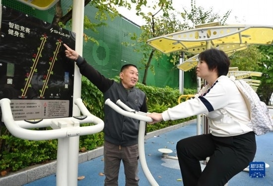 4月24日,西河智慧體育公園工作人員(左)向晨練的市民介紹具備對(duì)運(yùn)動(dòng)數(shù)據(jù)進(jìn)行采集、分析等多項(xiàng)功能的智能競(jìng)賽健身車(chē)。