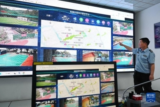 4月24日,西河智慧體育公園工作人員在介紹智慧體育綜合管控平臺(tái)。該平臺(tái)可對(duì)公園內(nèi)的人流、安全、環(huán)境以及公園周邊“15分鐘健身圈”運(yùn)動(dòng)場(chǎng)地的門(mén)禁、燈光等設(shè)備實(shí)現(xiàn)智能化管理。