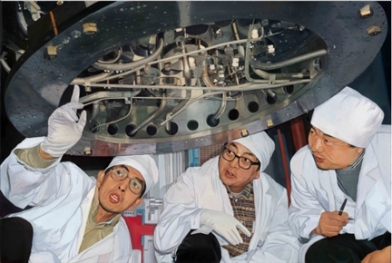 布面油畫《知難而進(jìn) 眾志成城》原型為新華社記者王呈選拍攝的一幅新聞?wù)掌?,畫面?0世紀(jì)80年代末清華大學(xué)核能與新能源技術(shù)研究院王大中、馬昌文、董鐸正在進(jìn)行5兆瓦低溫核反應(yīng)堆調(diào)試的場景。作品生動地刻畫了以國家最高科學(xué)技術(shù)獎獲得者王大中院士等為代表的清華教師勇于承擔(dān)國家重大科技項目,知難而進(jìn)、眾志成城的寶貴精神。