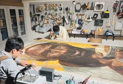 二〇二二年底,工作人員正在觀察油畫(huà)《父親》并準(zhǔn)備進(jìn)行修復(fù)。 寇旭乾攝