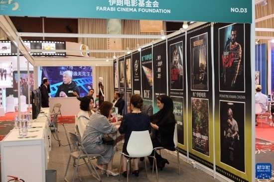 6月10日,咨詢者在第25屆上海國際電影節(jié)電影市場伊朗電影基金會展區(qū)與展商溝通。
