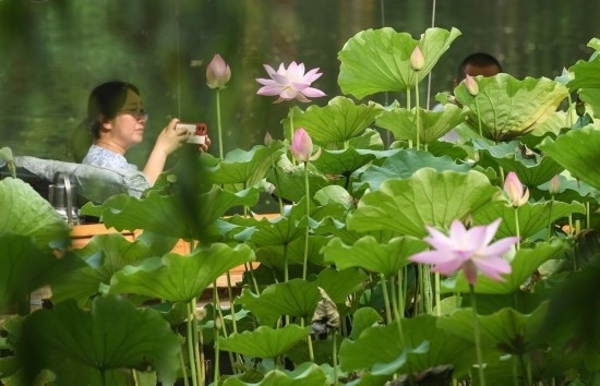 6月11日,游客在曲院風荷景區(qū)欣賞荷花。