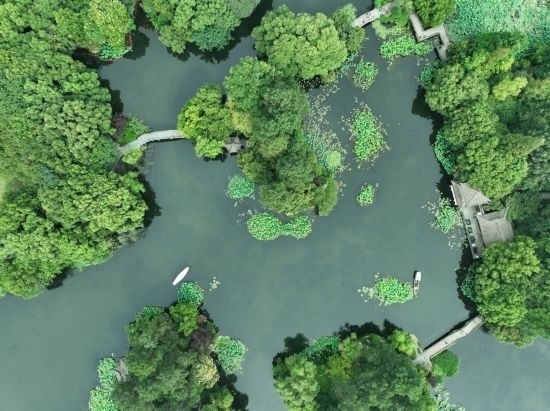 6月11日,游客在曲院風荷景區(qū)欣賞荷花(無人機照片)。