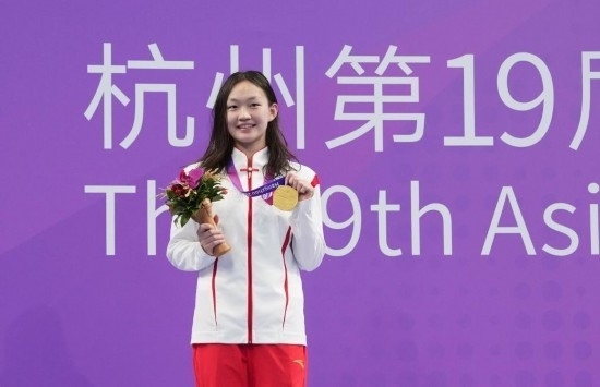 9月29日,中國選手張雨霏在賽后留影。當日,杭州亞運會游泳項目比賽全部進行完畢。新華社記者 黃宗治 攝