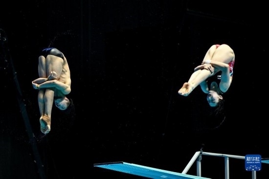 7月18日,中國(guó)選手司雅杰(右)/白鈺鳴在混雙三米板比賽中。