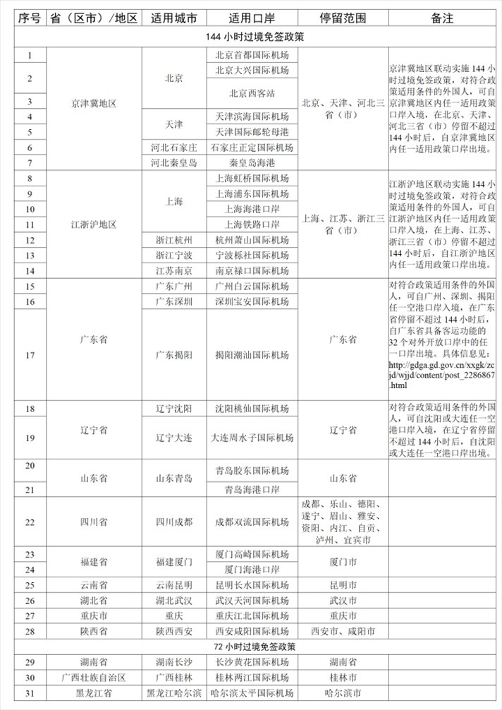如外國人符合上述條件,可向我國20個城市的邊檢機關(guān)提出辦理144小時過境免簽申請,或向3個城市的邊檢機關(guān)提出辦理72小時過境免簽申請,其他城市暫未實施該項政策。