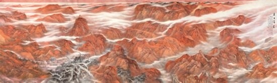 “山河”從來都不單純是自然山水的別稱,更多指代的是“社稷”與“國土”。在革命戰(zhàn)爭年代,“一寸山河一寸血,一抔熱土一抔魂”的詩句,不知激勵了多少仁人志士投身革命,為國捐軀。這個展覽以“山河回聲”為主題,也表明了樂震文、張弛的山水畫并不是傳統(tǒng)意義上臥游逍遙的文人山水,而是以山水建構(gòu)現(xiàn)代人文精神內(nèi)涵的國家史詩敘事。