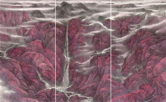 來自上海并深受海派畫學(xué)影響的樂震文、張弛,在宋元及明清山水畫學(xué)上打下了深厚的功底,也因此,他們的傳統(tǒng)山水畫深受日本民眾的歡迎。他們曾游居?xùn)|瀛多年,轉(zhuǎn)道再度研習(xí)了中國傳統(tǒng)文人畫。但真正改變他們畫風(fēng)的,卻是他們對中國北方大山大水的寫生攬勝。他們鐘情于英雄的太行山,忘情于革命勝地陜北高原,力求通過壯闊雄渾的山巒、連綿逶迤的群峰來表達(dá)他們的時代感悟,營構(gòu)儲存于他們胸中的山川氣象。所謂“山河回聲”,正是這些作品抒發(fā)的中華民族歷經(jīng)歲月風(fēng)華在大好河山之中回響的奮斗激情。