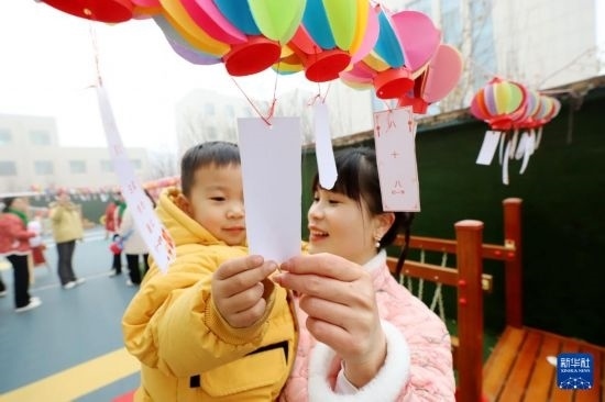 12月30日,在山東省濱州市惠民縣一所幼兒園,小朋友和家長(zhǎng)一起猜燈謎。