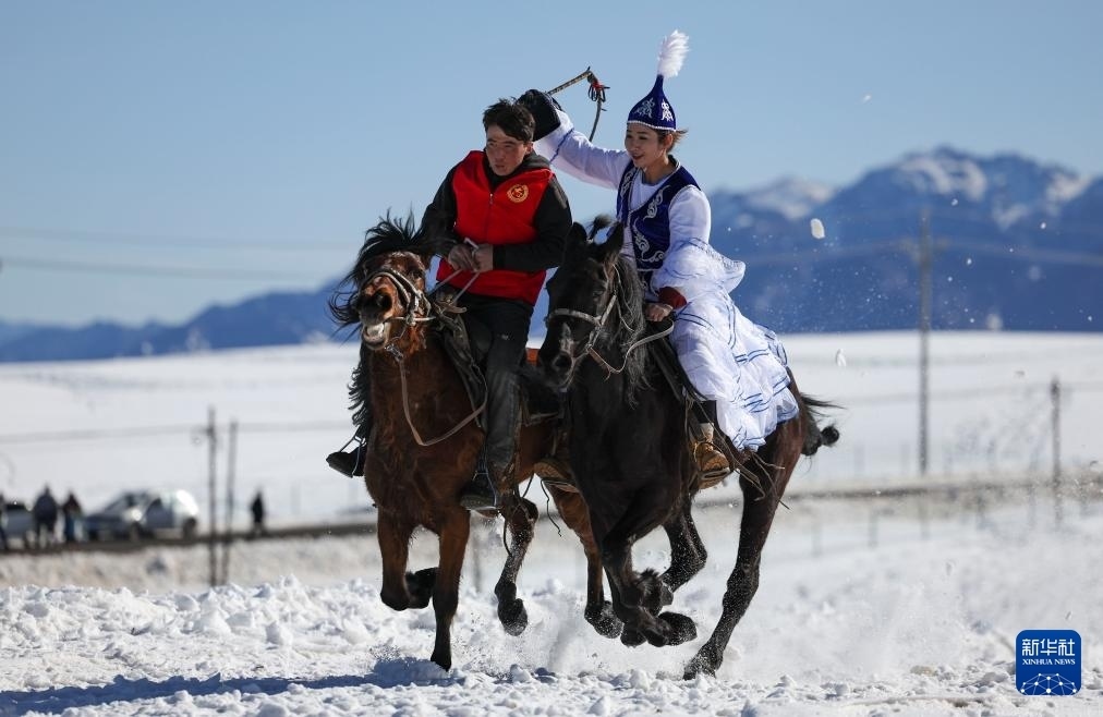 農(nóng)歷大年初二,新疆烏魯木齊縣“春節(jié)八天樂”系列活動(dòng)——傳統(tǒng)體育民俗鬧新春在甘溝鄉(xiāng)進(jìn)行。村民們?cè)诒└采w的烏拉斯臺(tái)草原上進(jìn)行雪地賽馬、“姑娘追”、馬上拾銀、叼羊等比賽,歡度新春。