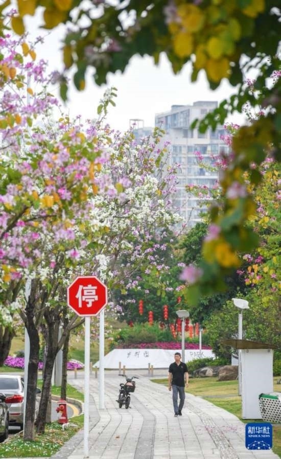 2月22日,在深圳前海街頭,市民從開花的樹下走過。