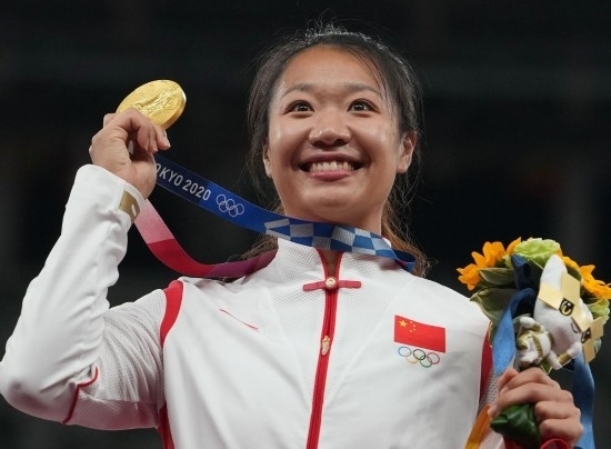 2021年8月7日,冠軍劉詩穎在東京奧運會田徑項目女子標槍頒獎儀式上。新華社記者 呂小煒 攝