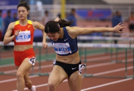 3月13日,四川隊選手吳艷妮(右)在女子60米欄決賽中沖刺撞線。新華社記者 廖宇杰 攝