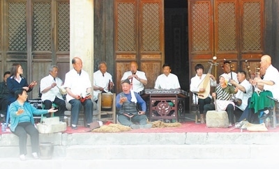 有靜也有動。如今,村中常有當?shù)卮迕窈头沁z傳承人自發(fā)組織的“中莊秧歌”“打鐵花”等非遺演出,吸引不少游客。在司徒第院內,樹齡超400年的臘梅依舊枝繁葉茂。樹下,一位穿著白大褂、扎著白頭巾的老漢與一旁穿著紅襖藍裙的老太太一同上場,來到院內的月臺上,一唱一和,用晉城方言演起了節(jié)目。這是村民崔有正、牛玉鳳夫婦,他們曾經是部隊文藝骨干,現(xiàn)在利用閑暇表演。