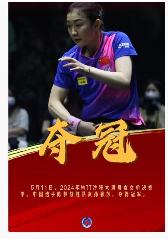 今天,在2024年WTT沙特大滿貫賽女單決賽中,中國選手陳夢戰(zhàn)勝隊友孫穎莎 ,奪得冠軍。祝賀陳夢,孫穎莎辛苦了!拼過就是勝利,繼續(xù)加油!(記者:王海洲)