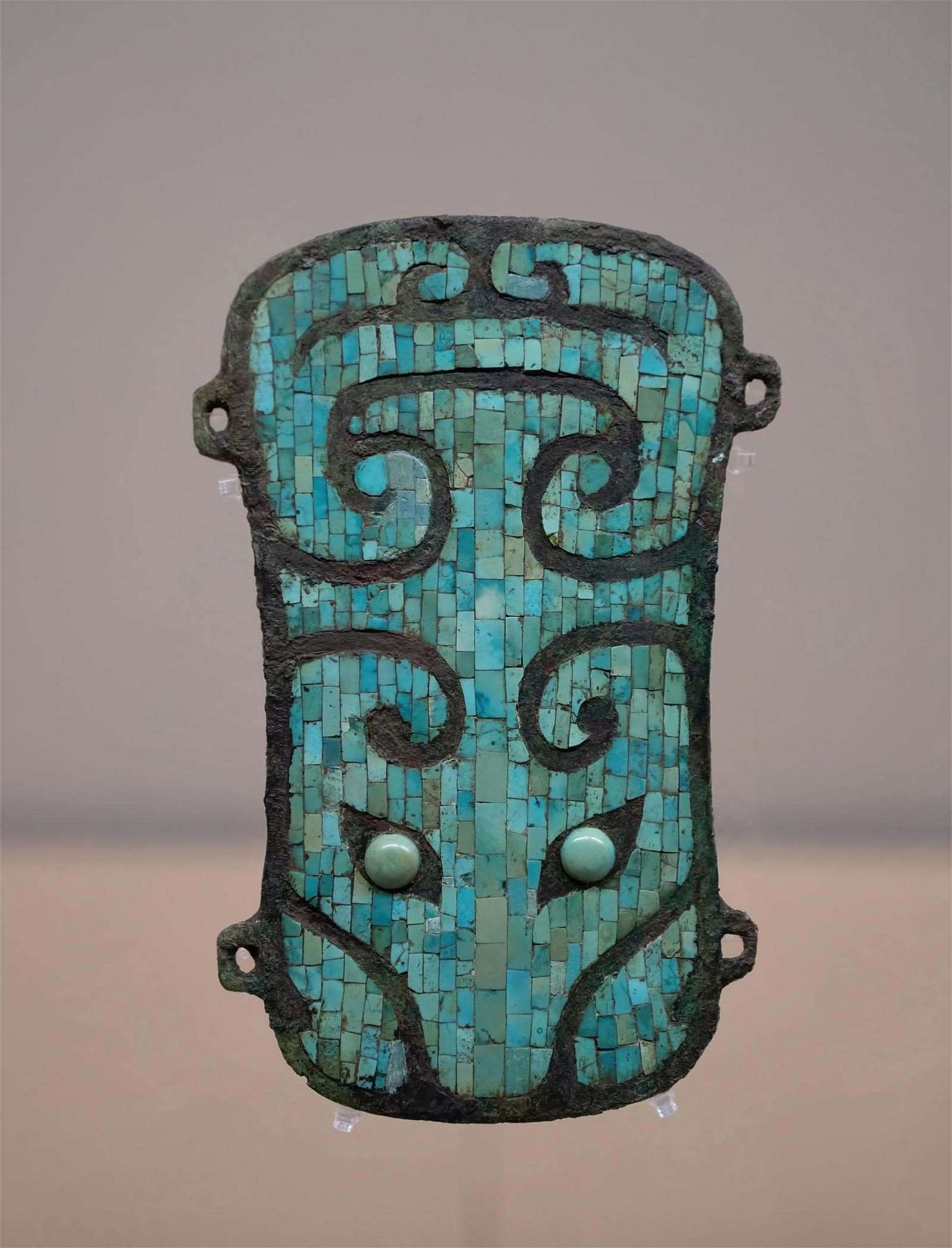 3500年前的鑲嵌綠松石獸面紋銅牌飾,是二里頭夏都遺址博物館的“頂流”。它器身用貴金屬青銅鑄出主體框架,略微拱起的弧形銅胎上,鑲嵌著數(shù)百片綠松石,神奇絢爛。它的發(fā)掘地二里頭遺址是中國(guó)古代文獻(xiàn)記載的第一個(gè)王朝夏朝的都城,牌飾上,綠幽幽的“眼睛”見(jiàn)證了“最早的中國(guó)”。