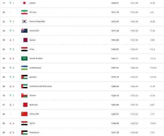 亞洲前三為日本隊、伊朗隊、韓國隊