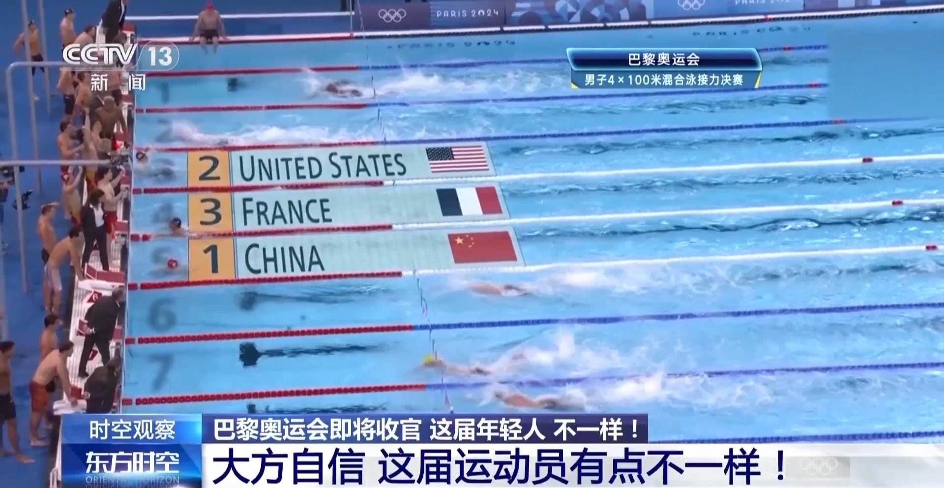 巴黎奧運(yùn)會游泳賽場最后一個比賽日,中國隊(duì)放了個大招。男子4X100米混合泳接力決賽上,中國隊(duì)力壓該項(xiàng)目40年“霸主”美國隊(duì),以3分27秒46的成績奪冠。