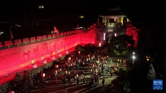 8月21日,游客在觀看“大明邊塞”之夜游黃崖關系列演出(無人機照片)。