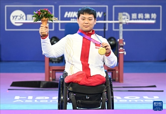 圖為2023年10月24日,中國選手齊勇凱在杭州第4屆亞殘運(yùn)會(huì)舉重項(xiàng)目男子59公斤級(jí)頒獎(jiǎng)儀式上。新華社記者 貝赫 攝