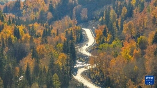 這是10月1日在新疆阿勒泰拍攝的阿禾公路沿途風(fēng)景(無(wú)人機(jī)照片)。