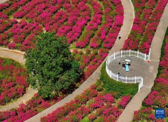 游人在南寧青秀山風(fēng)景區(qū)葉子花園觀賞三角梅(10月25日攝,無人機(jī)照片)。
