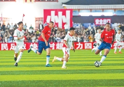 貴州“村超”一場(chǎng)中外友誼賽中,中國(guó)球員和巴西球員在比賽中拼搶。 周光勝攝(影像中國(guó))