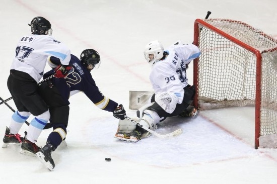 2024年12月8日,北京京獅男子冰球隊(duì)球員侯宇陽(yáng)(中)在2024-2025賽季中國(guó)男子冰球職業(yè)聯(lián)賽(齊齊哈爾站)比賽中射門。新華社記者 張濤 攝
