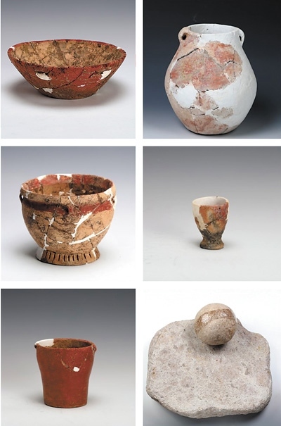 外圍人工土臺(tái)一般用純凈的黃褐色黏土堆筑而成,大多呈東西向的長方形。土臺(tái)上目前已揭露房址2處、灰坑23座、器物坑28座、高等級(jí)墓葬3座。墓葬的墓坑呈長方形,東西向或南北向。隨葬陶器較多,均在20件以上,主要有平底罐、圈足罐、大口盆等,有的墓葬還隨葬石器。從隨葬品的數(shù)量看,等級(jí)較高,說明在稻作農(nóng)業(yè)經(jīng)濟(jì)的支撐下,距今9000年左右,上山文化社會(huì)較早地出現(xiàn)了社會(huì)分化。