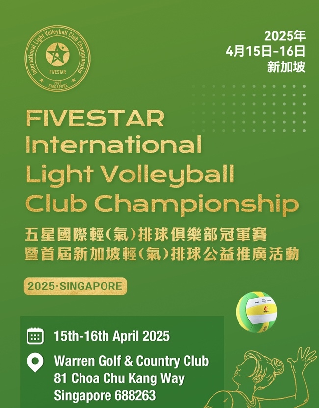 2025年4月15日至16日,2025“五星”國(guó)際輕(氣)排球俱樂部冠軍賽將在新加坡Warren Golf &Country Club啟幕,這也是氣排球首次登陸新加坡。