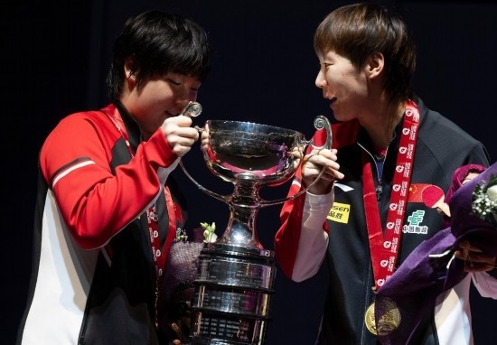 5月25日,冠軍中國組合王曼昱/蒯曼(左)在頒獎(jiǎng)儀式上。當(dāng)日,在卡塔爾多哈舉行的2025世界乒乓球錦標(biāo)賽女子雙打決賽中,中國組合王曼昱/蒯曼3比0戰(zhàn)勝波爾卡諾娃(奧地利)/斯佐科斯(羅馬尼亞)組合,奪得冠軍。新華社記者 肖藝九 攝