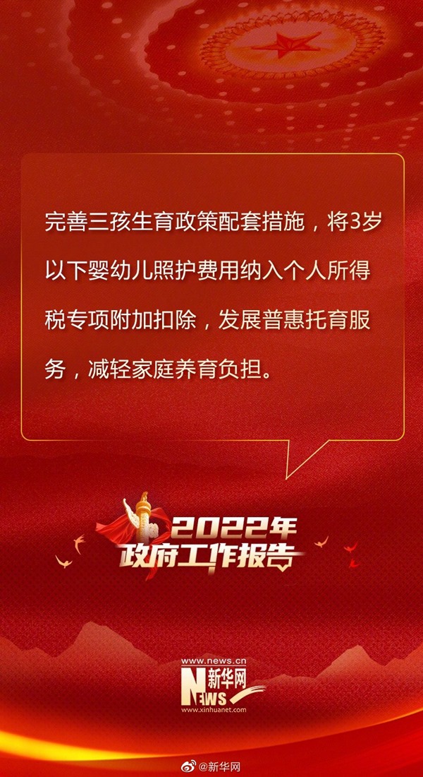 加強(qiáng)社會保障和服務(wù)。穩(wěn)步實施企業(yè)職工基本養(yǎng)老保險全國統(tǒng)籌,適當(dāng)提高退休人員基本養(yǎng)老金和城鄉(xiāng)居民基礎(chǔ)養(yǎng)老金標(biāo)準(zhǔn),確保按時足額發(fā)放。繼續(xù)規(guī)范發(fā)展第三支柱養(yǎng)老保險。加快推進(jìn)工傷和失業(yè)保險省級統(tǒng)籌。做好軍人軍屬、退役軍人和其他優(yōu)撫對象優(yōu)待撫恤工作。積極應(yīng)對人口老齡化,優(yōu)化城鄉(xiāng)養(yǎng)老服務(wù)供給,支持社會力量提供日間照料、助餐助潔、康復(fù)護(hù)理等服務(wù),鼓勵發(fā)展農(nóng)村互助式養(yǎng)老服務(wù),推動老齡事業(yè)和產(chǎn)業(yè)高質(zhì)量發(fā)展。完善三孩生育政策配套措施,將3歲以下嬰幼兒照護(hù)費(fèi)用納入個人所得稅專項附加扣除,發(fā)展普惠托育服務(wù),減輕家庭養(yǎng)育負(fù)擔(dān)。強(qiáng)化未成年人保護(hù)。提升殘疾預(yù)防和康復(fù)服務(wù)水平。加強(qiáng)民生兜底保障和遇困群眾救助,努力做到應(yīng)保盡保、應(yīng)助盡助。