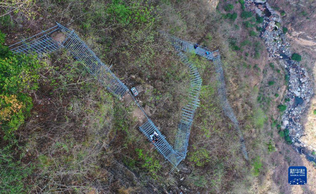 在四川涼山彝族自治州昭覺縣阿土列爾村的懸崖鋼梯上,“懸崖村”村民沿著鋼梯下山(2020年5月13日攝,無人機(jī)照片)。新華社記者 王曦 攝