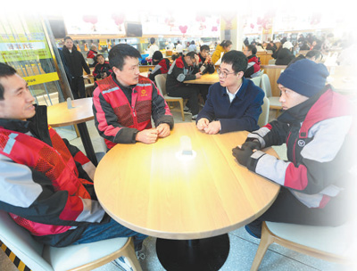 近日,全國(guó)人大代表、浙江晨泰科技股份有限公司副總工程師胡東方(右二)深入快遞員、外賣騎手群體,了解他們的所想所需。