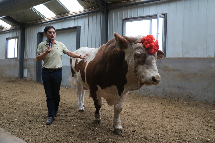 在內(nèi)蒙古巴林左旗內(nèi)蒙古廣匯牧業(yè)肉牛綜合示范園區(qū),頭戴大紅花的肉牛格外醒目,原來這是獲得該旗肉牛大賽二等獎(jiǎng)的獲獎(jiǎng)牛,重2200斤,價(jià)值33000元。